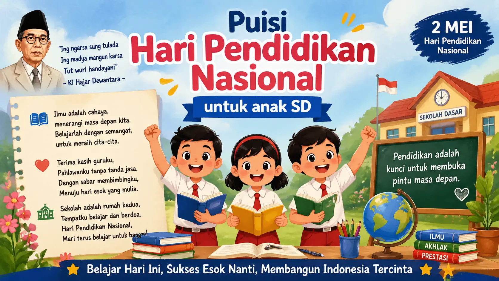 operatorsekolah.id – Hari Pendidikan Nasional selalu menjadi momen penting untuk meneguhkan kembali penghormatan kami terhadap ilmu, guru, sekolah, dan perjuangan panjang bangsa dalam mencerdaskan kehidupan generasi penerus. Melalui puisi, semangat pendidikan dapat disampaikan dengan bahasa yang indah, berwibawa, dan menyentuh hati. Setiap larik mampu menggambarkan betapa besar peran pendidikan dalam membentuk karakter, membuka jalan masa depan, serta menanamkan nilai kebangsaan di dalam diri anak-anak Indonesia.
